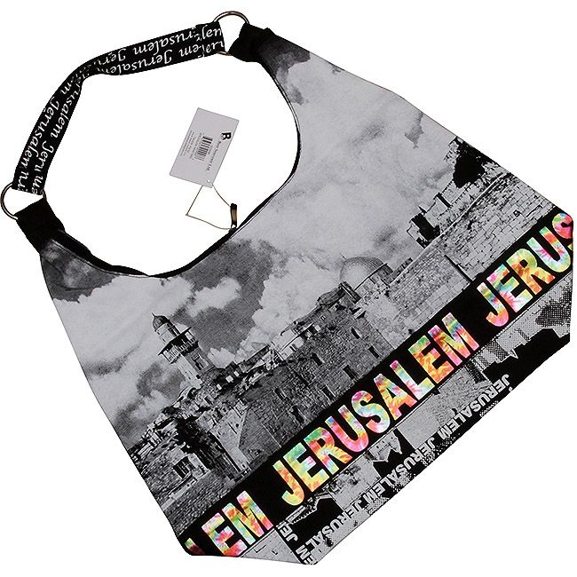 High quality Hobo Bag with large colorful foil 'Jerusalem' written in English and featuring a photograph of the 'Western Wall' - 'Kotel' and a Jerusalem old city skyline.