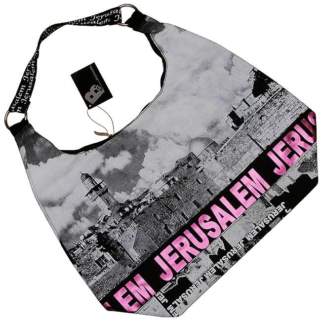 High quality Hobo Bag with large purple foil 'Jerusalem' written in English and featuring the 'Western Wall' - 'Kotel' in Hebrew and the word 'Jerusalem' the capital of Israel in various sized mirrored pattern design.