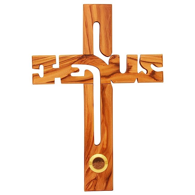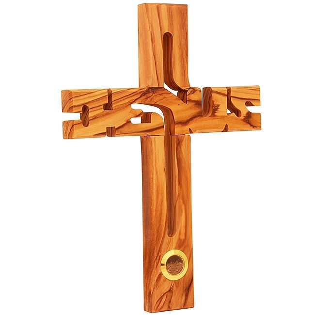 Jesus Cross in Olive Wood with Earth from Jerusalem in a glass window at the base.