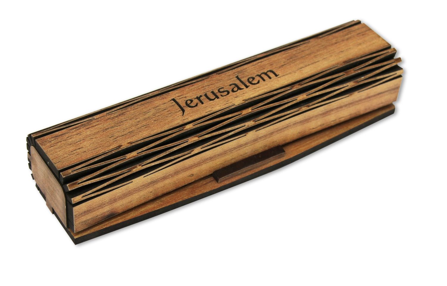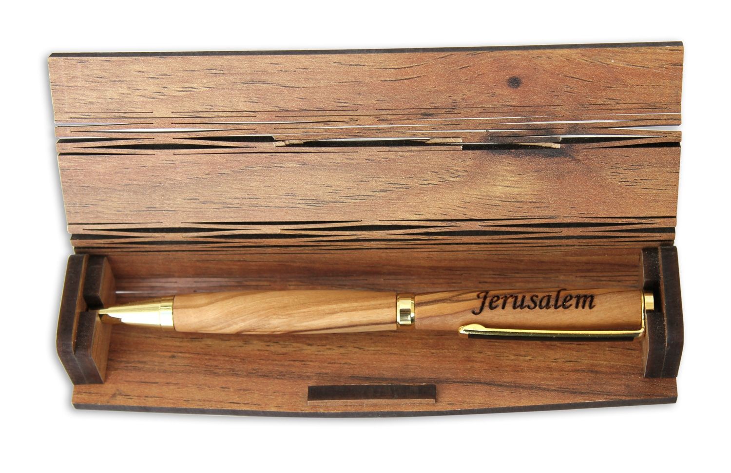 Wonderfully crafted elegant olive wood ballpoint pen with matching olive wood display case with 'Jerusalem' engraved on it's top - Handmade by a Christian owned family business in Bethlehem - the birthplace of Yeshua (Jesus)