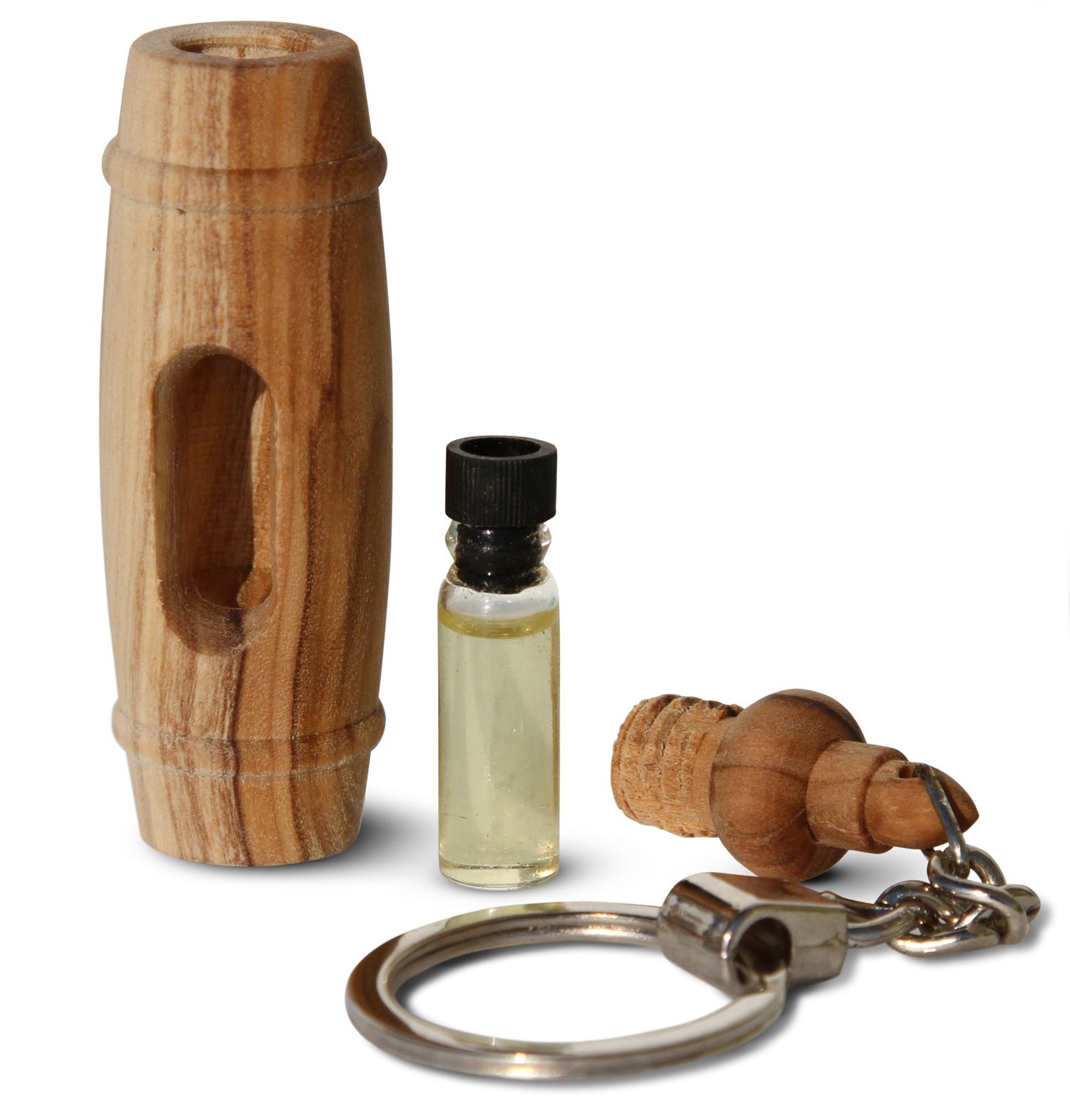 A kit of Olivewood Keychain filled with quality Frankincense & Myrrh Anointing Oil made in Bethlehem. It comes with a bottle of Ein Gedy Frankincense & Myrrh Anointing Oil for a refill.
