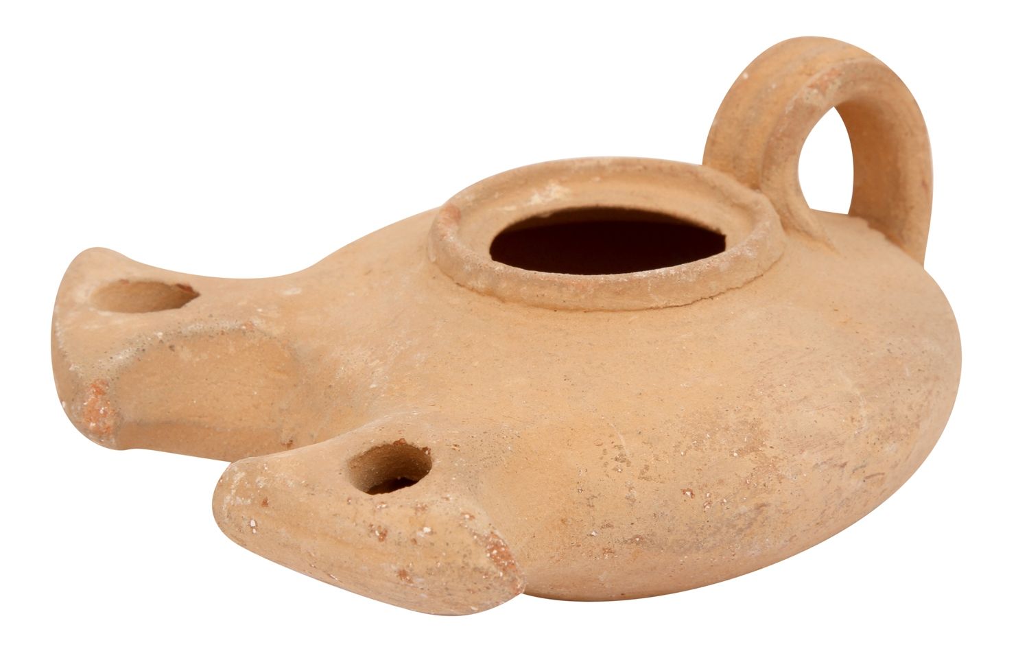 This is a fully functional Herodian (50 BC to AD 50) replica oil lamp with two flames and handle.
