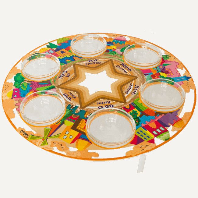 Your Passover Seder will be extra special this year with this work of art Seder Plate. Created by Israeli artist Alla Pikovski in laser cut metal and printed with a colorful motif of Jerusalem. This Passover Plate comes with 6 small glass bowls that fit perfectly into the to plate to hold the 6 important ingredients for the Passover meal. It also stands on three legs elevating it from the table to show its importance in the Passover Seder and so all can see its beauty.
