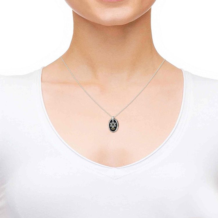 These inspiring necklaces for men and women featuring the 'Shema" in Hebrew from Deuteronomy 6:4 inscribed exclusively in 24k pure gold on natural onyx inside a Star of David and framed in a sterling silver oval frame.
