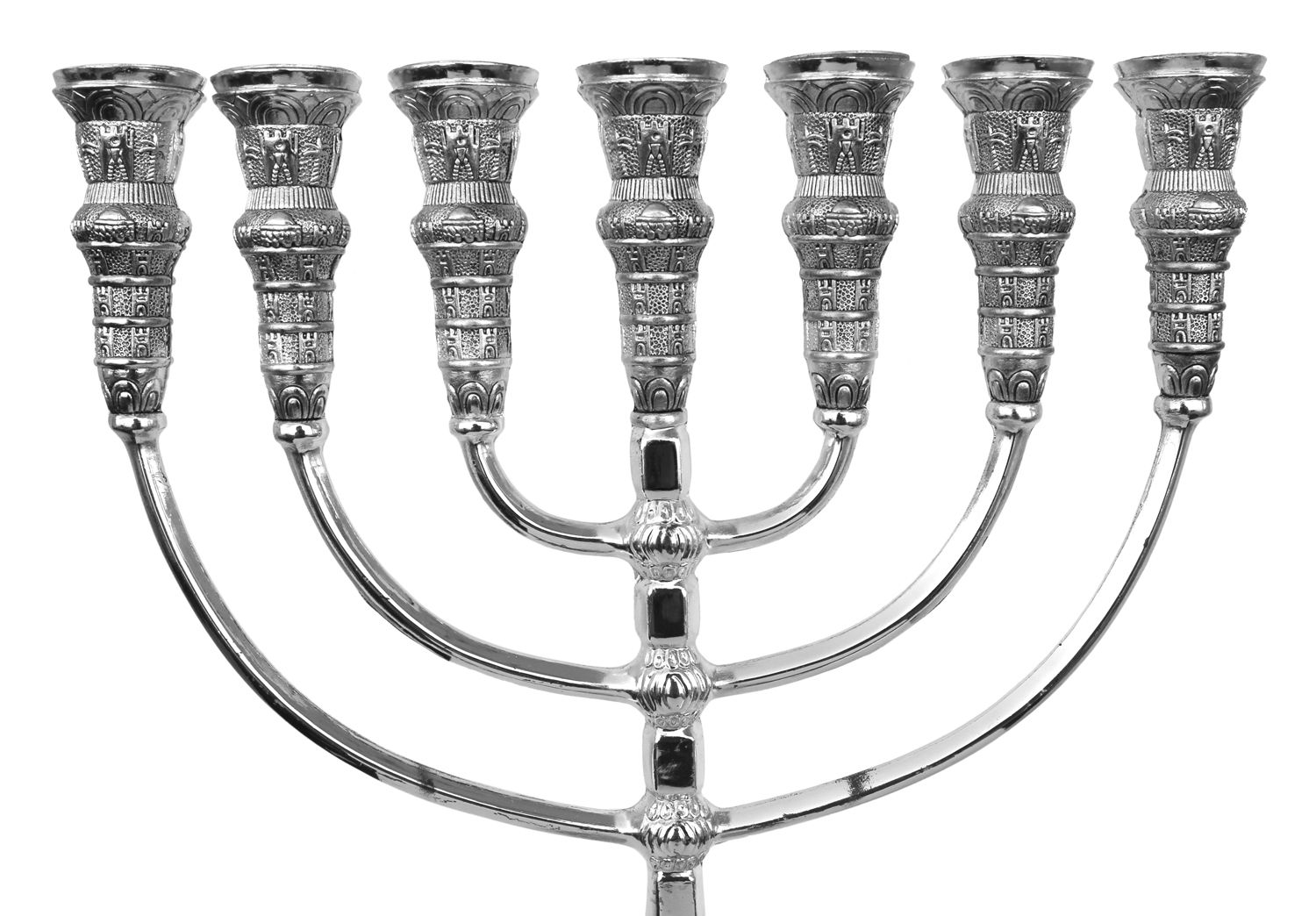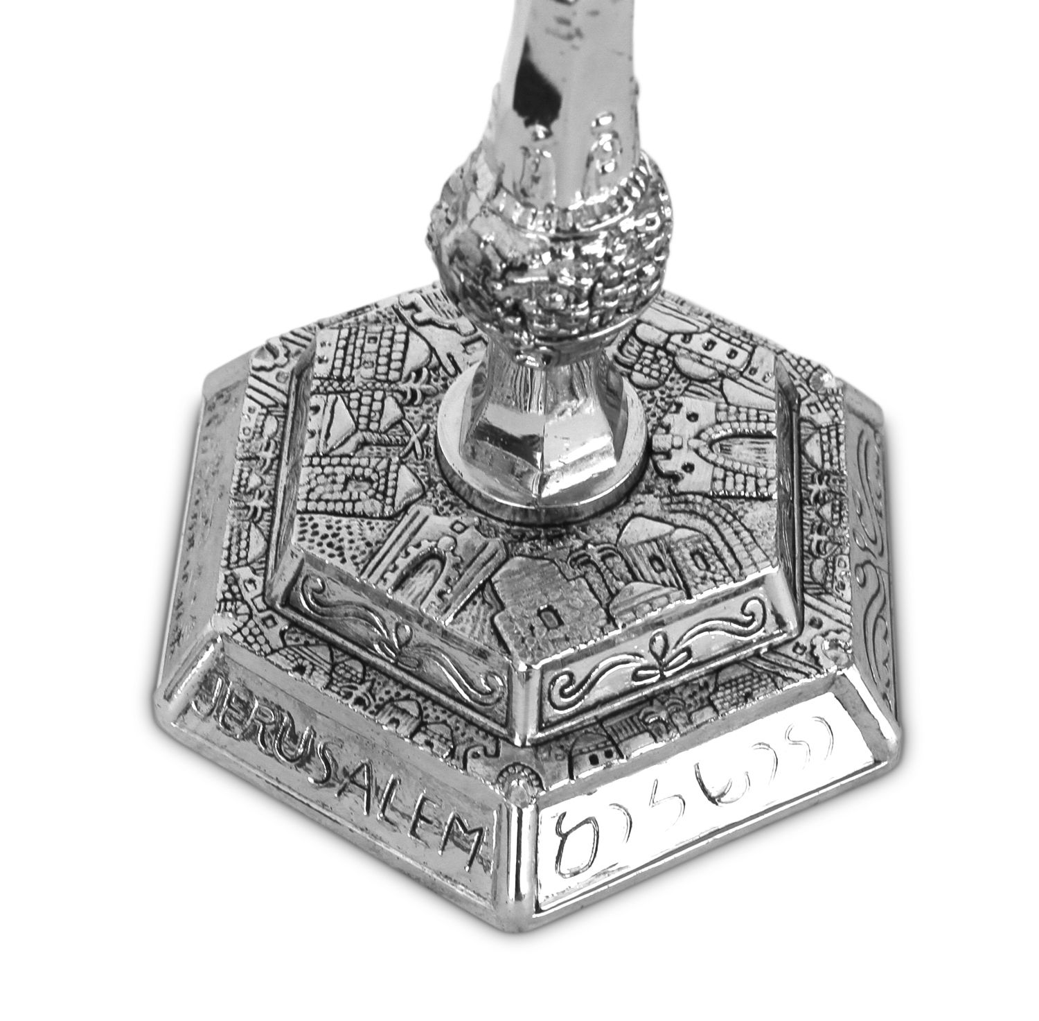 Highly detailed Menorah silver colored featuring a Jerusalem scene around the base and written 'Jerusalem' in English and Hebrew.