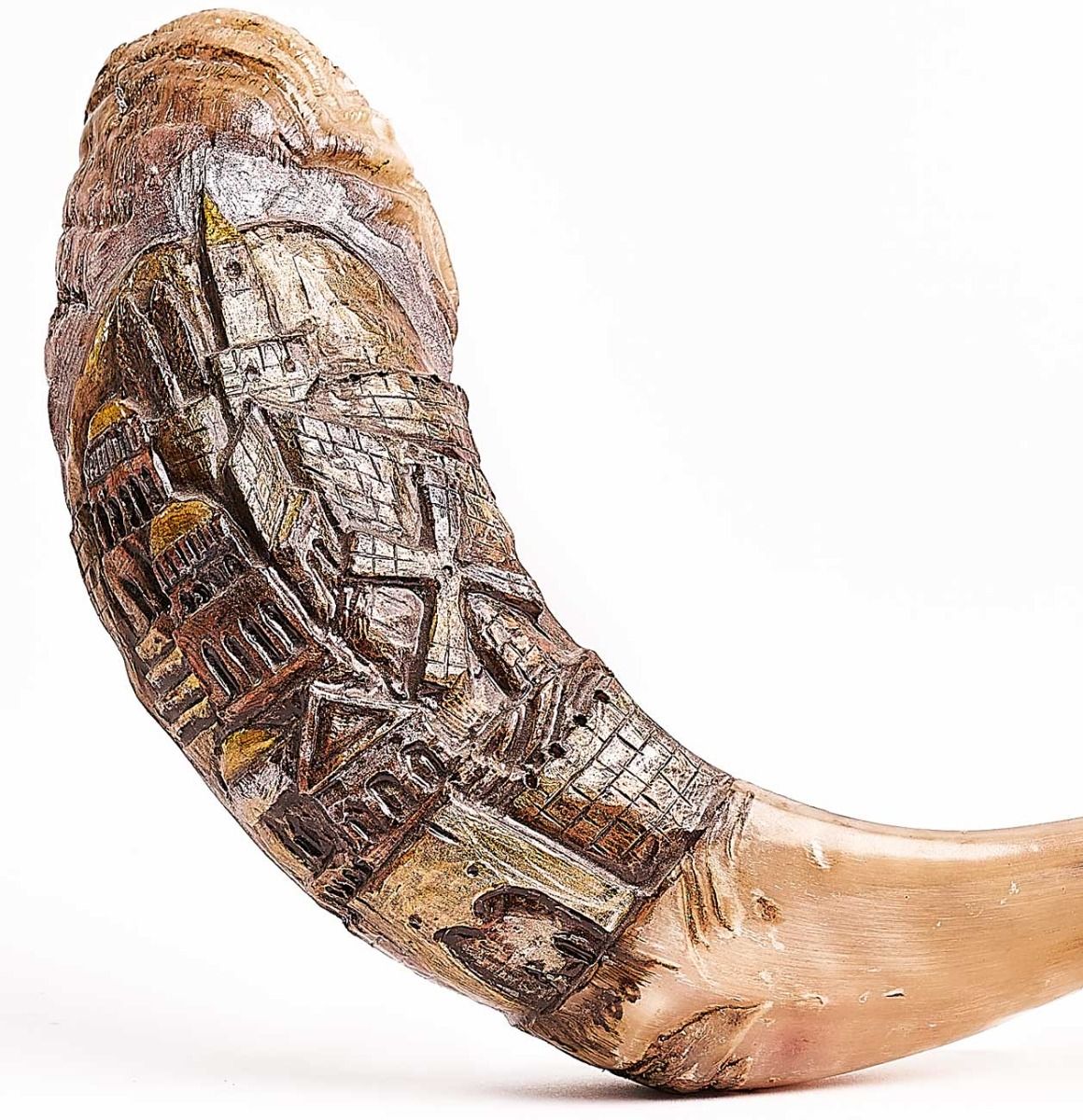 This Ram's horn Shofar has the Jerusalem view engraved on it. it was hand-carved by the Israeli artist Andrey Sofin.