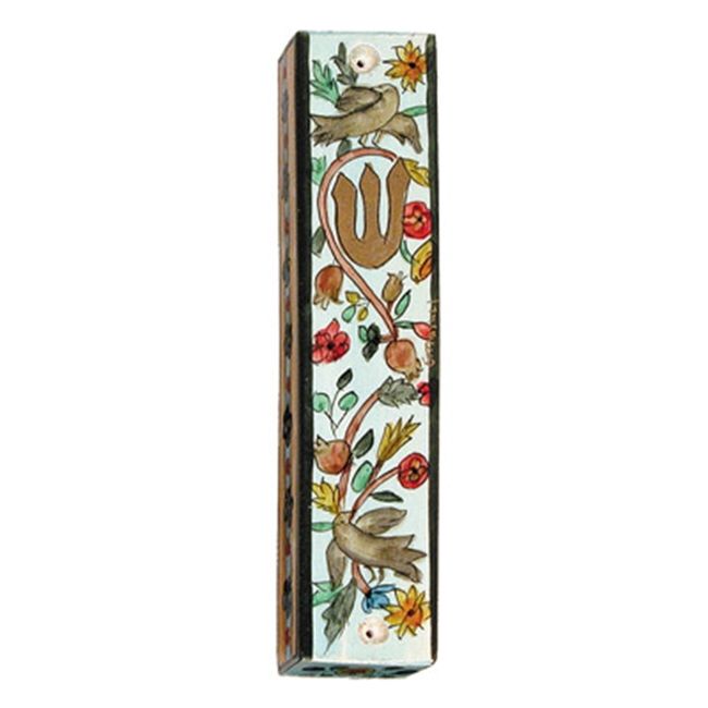 The delightful birds perched on flowered branches with the Hebrew letter SHIN in gold design has been meticulously hand-painted on wood to form a mezuzah that combines the traditional and modern to bring an essence of today's Holy Land to your home.