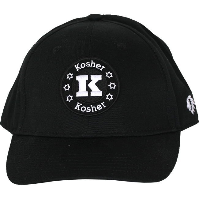 100% cotton snapback hat. Embroidered with a large K with the words kosher.