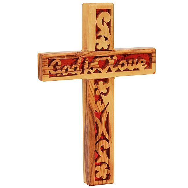 Beautifully handmade from 100% aged Olive Wood this 'God is Love' Cross features a background of red enamel symbolic of HIS sacrifice and engraved with a heart - all lovingly created by a Christian family business in the town of Yeshua / Jesus birthplace, Bethlehem.